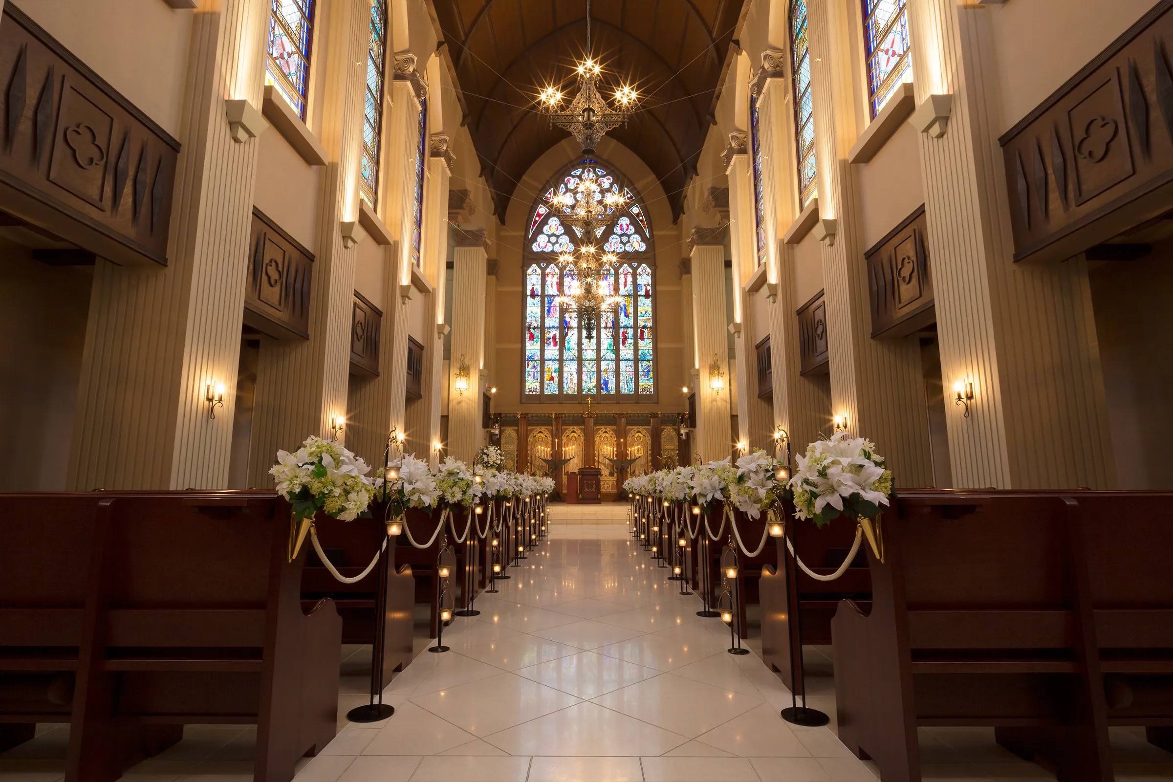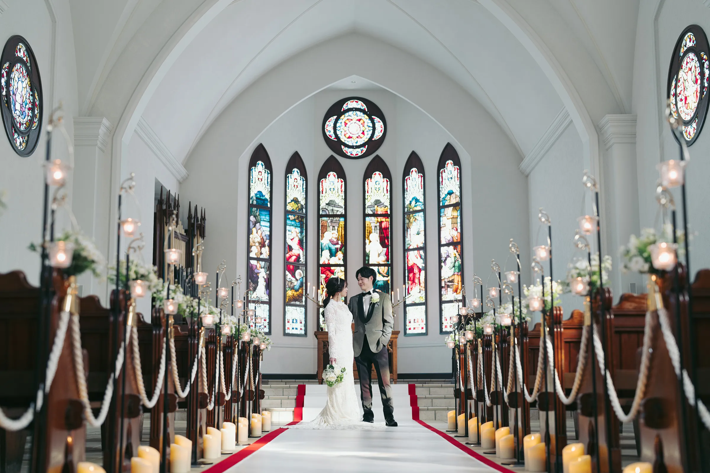 ステンドグラスの光が、愛の誓いを優しく照らし、未来への一歩を美しく、鮮やかに彩ります。