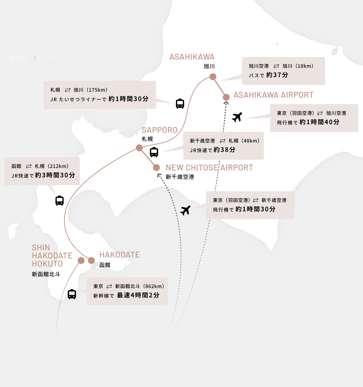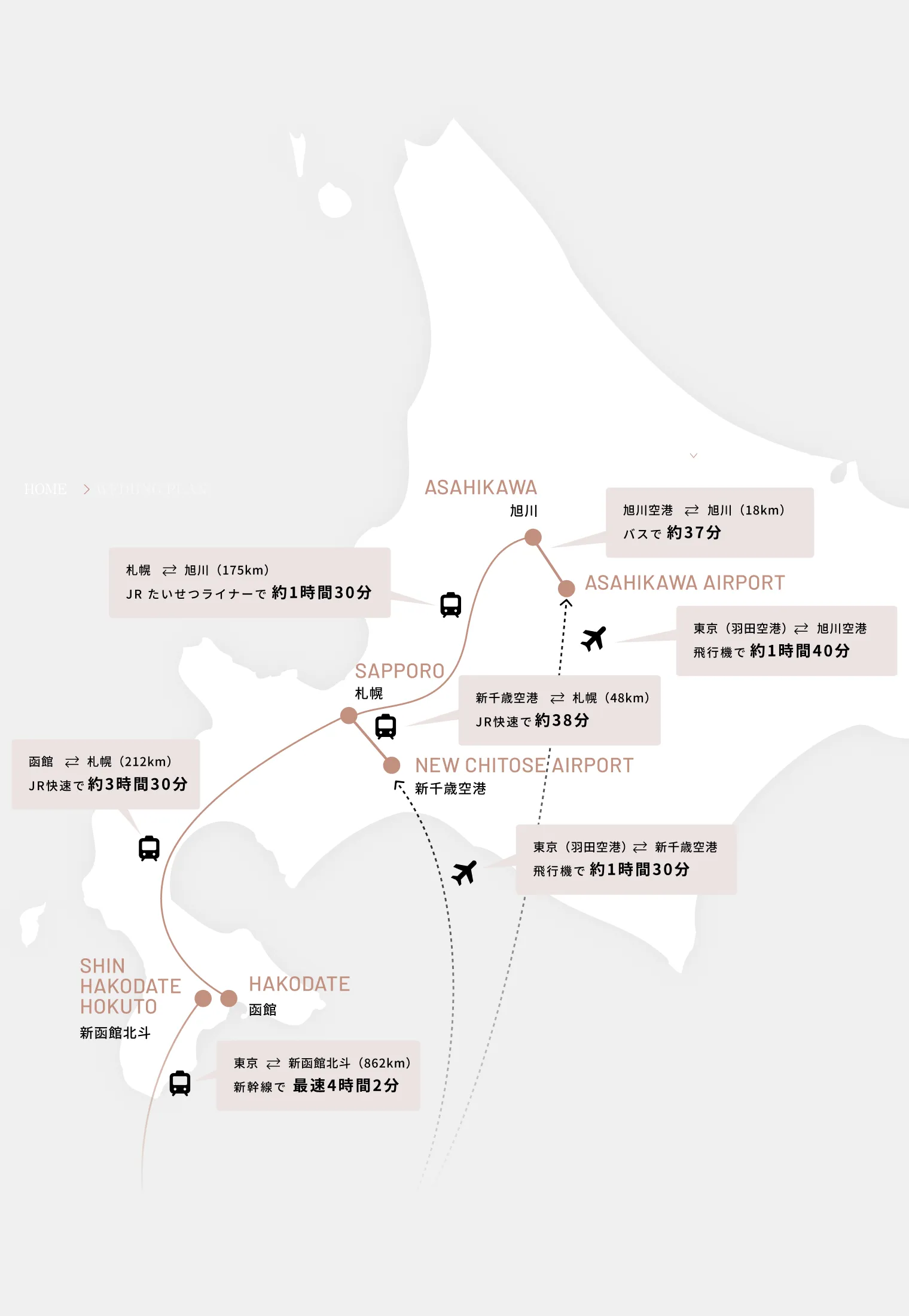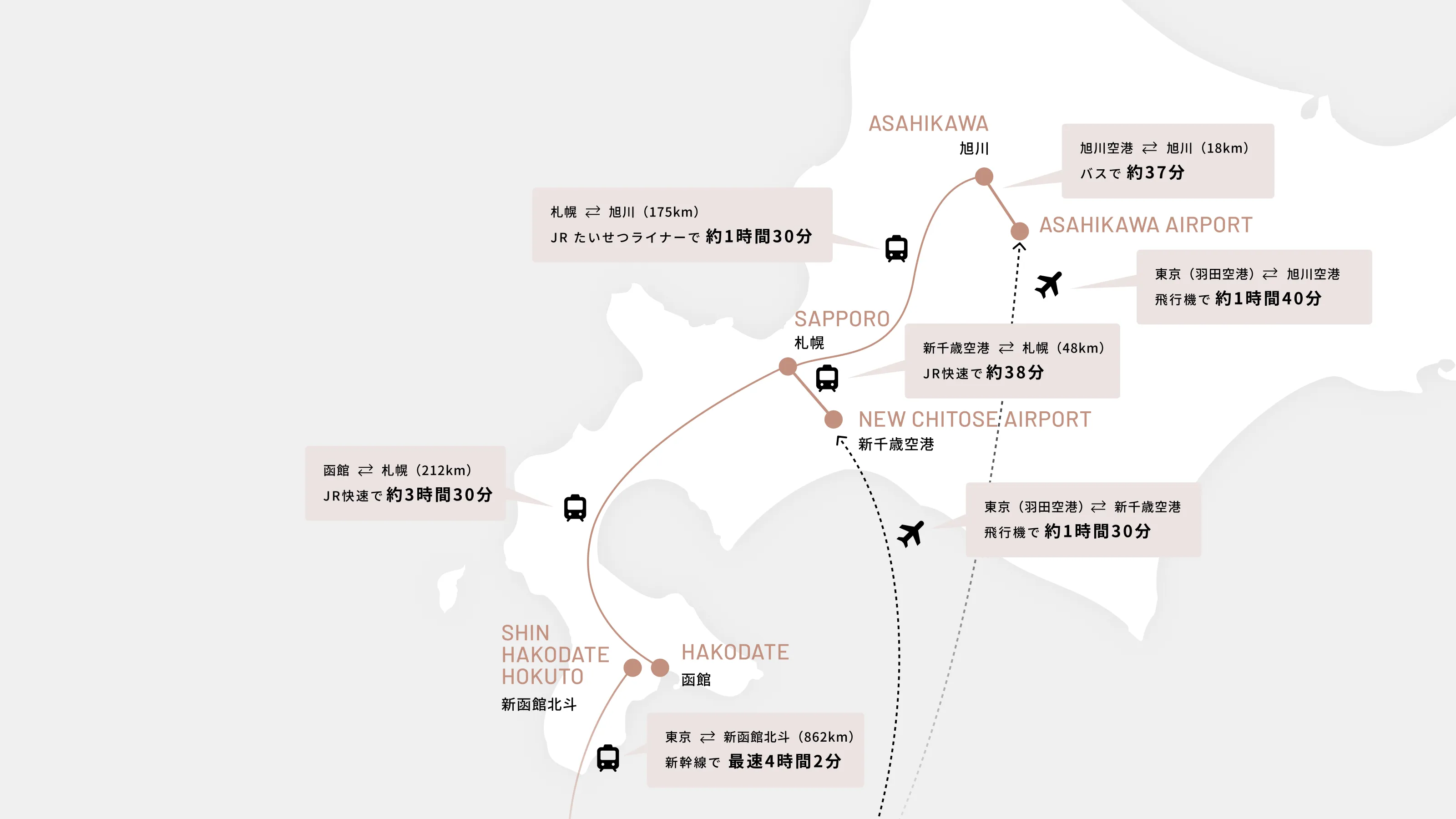 札幌から函館までは車で約4〜5時間、旭川から網走までは約3時間以上かかるなど、