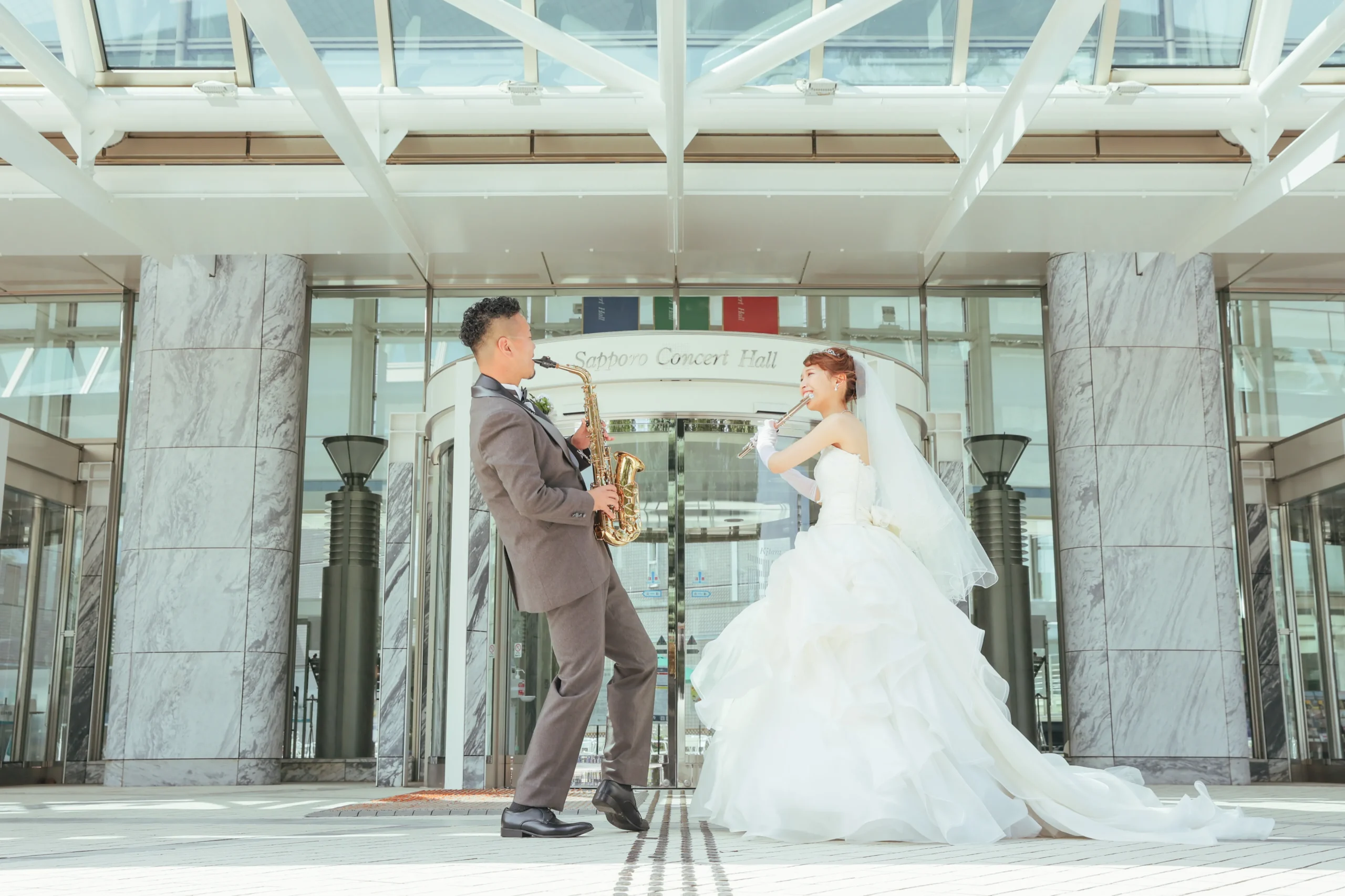 中島公園にある札幌コンサートホールKitaraの前での一枚。おニ人の思いおもいの楽器を手に、特別な装いでおニ人らしい姿を切り取った1枚。何年たっても訪れたい思い出のスポットに