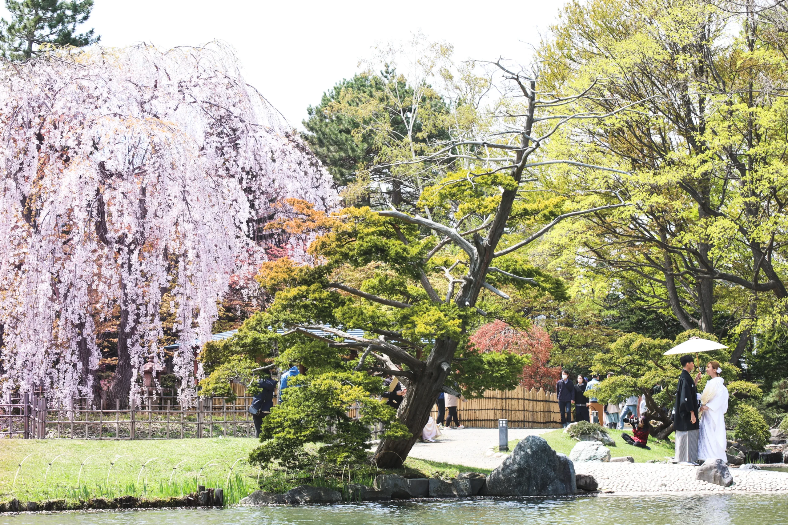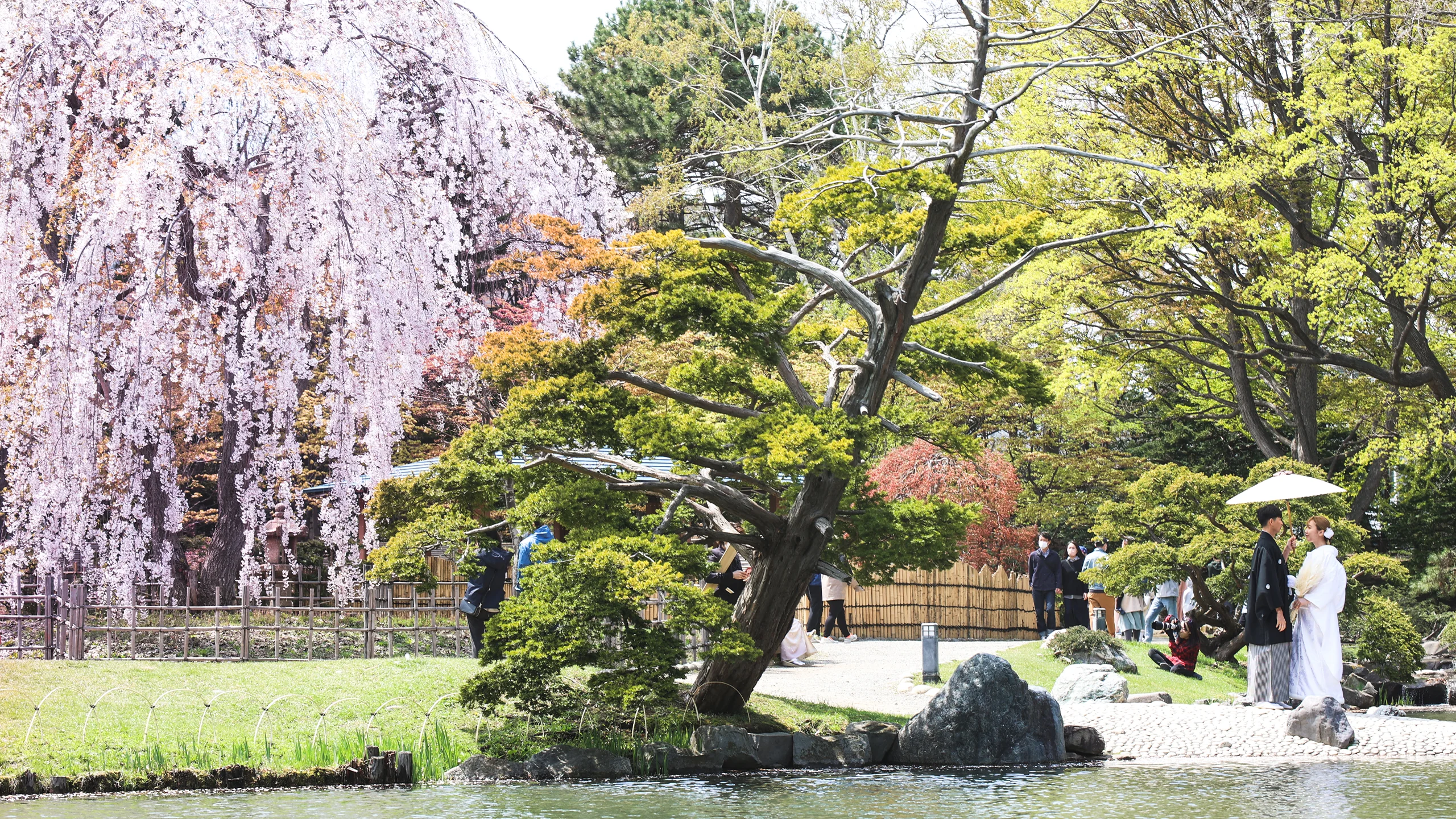 中島公園内にある日本庭園は、日本の伝統に基づいて作られた歴史ある庭園。昔ながらの婚礼衣裳である、白無垢と紋付き袴で日本の美を感じるお写真が撮影できます。