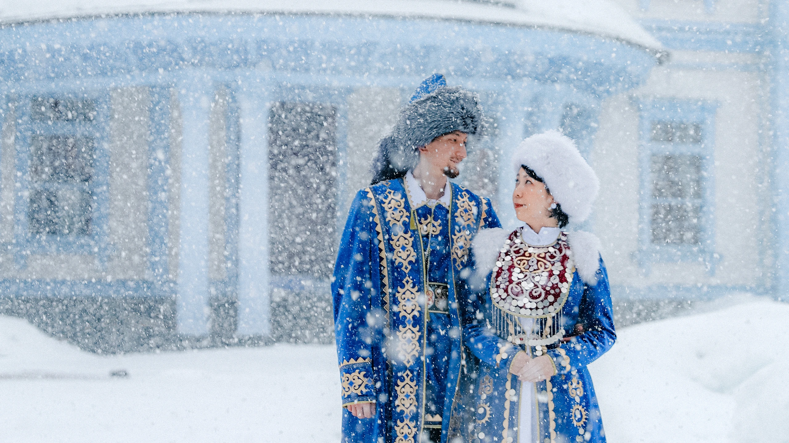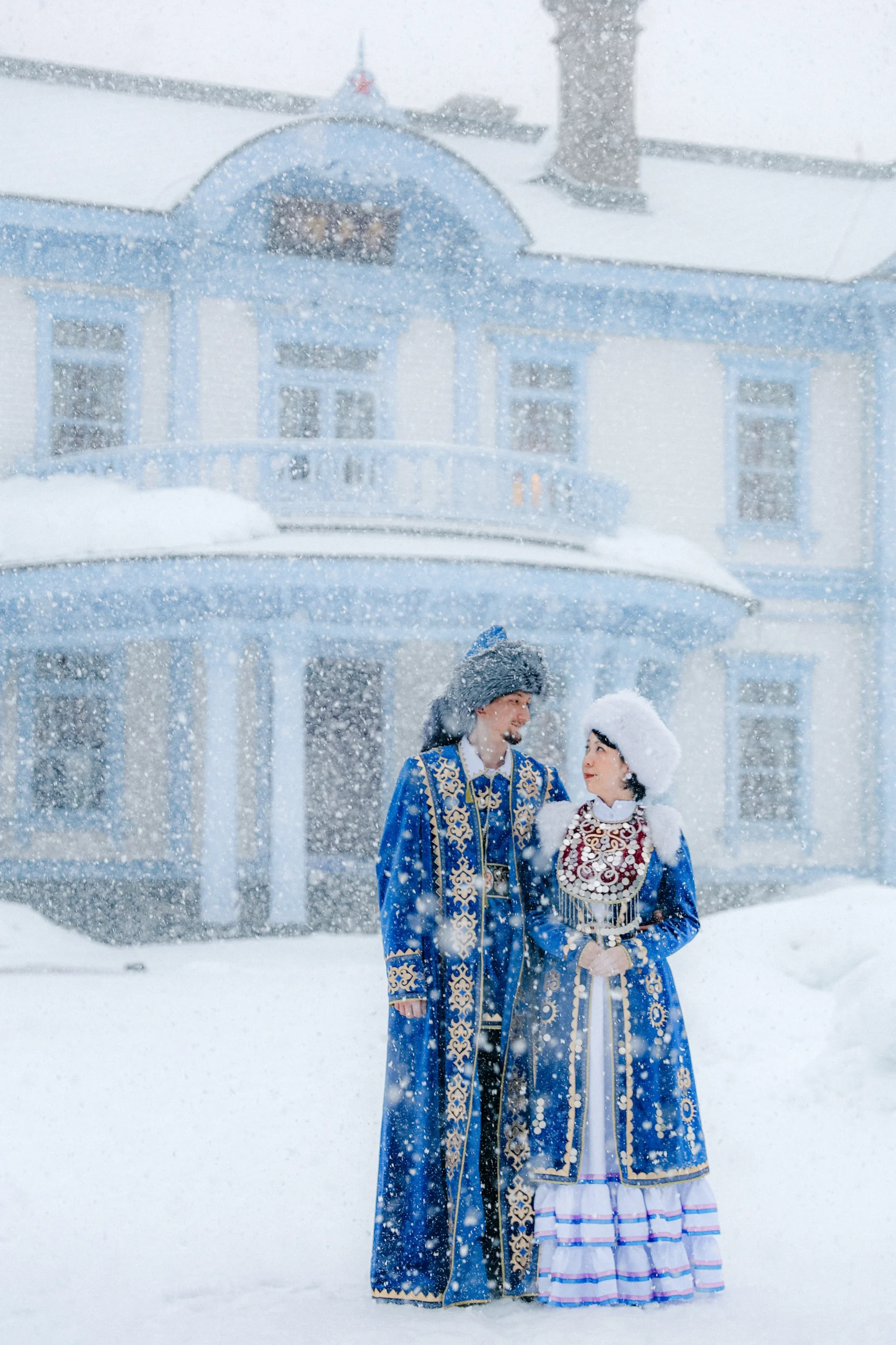 中島公園内にある明治初期に建てられた、国指定重要文化財「豊平館」で撮影された雪がぴったりの童話のようなお写真。鮮やかな青の民族衣装のおニ人と雪に包まれた豊平館が幻想的な世界を演出しています。