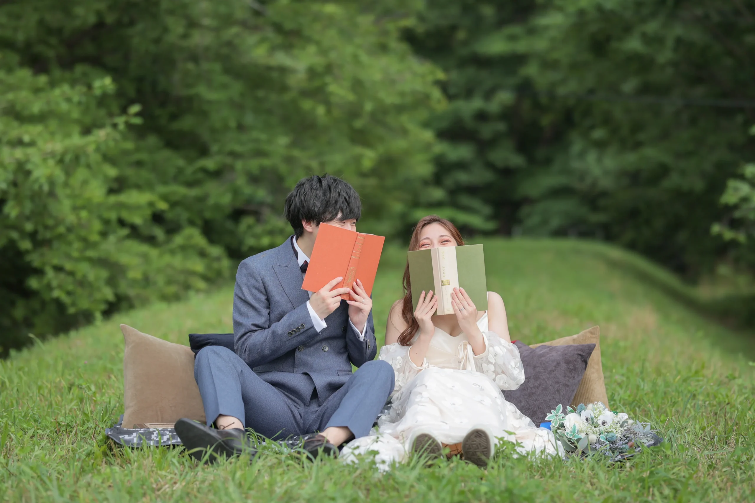 普段のおニ人の雰囲気を感じられる一枚。公園の緑の上にシートを敷いておニ人だけの空間を楽しむ。くつろいだ雰囲気自然な表情に小物で演出をきかせたショットです。