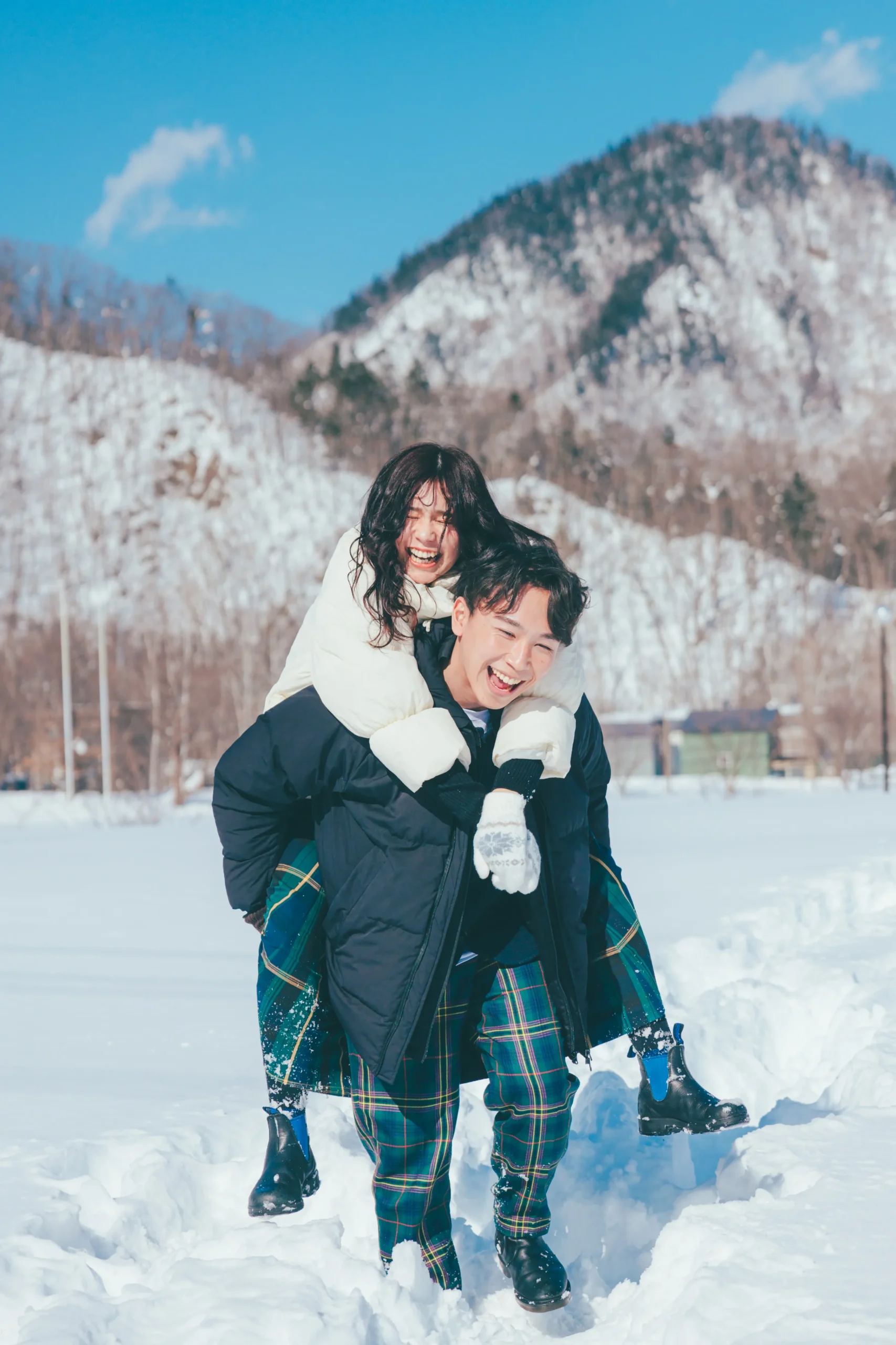 北海道で雪のフォトを。北海道旅行の想い出に、おニ人の自然な姿を撮影したい方に。普段の服装での撮影も、ナチュラルな表情や普段のおニ人の雰囲気を感じられる素敵なお写真になります。記念日やおニ人の節目として、気軽に撮影できます。