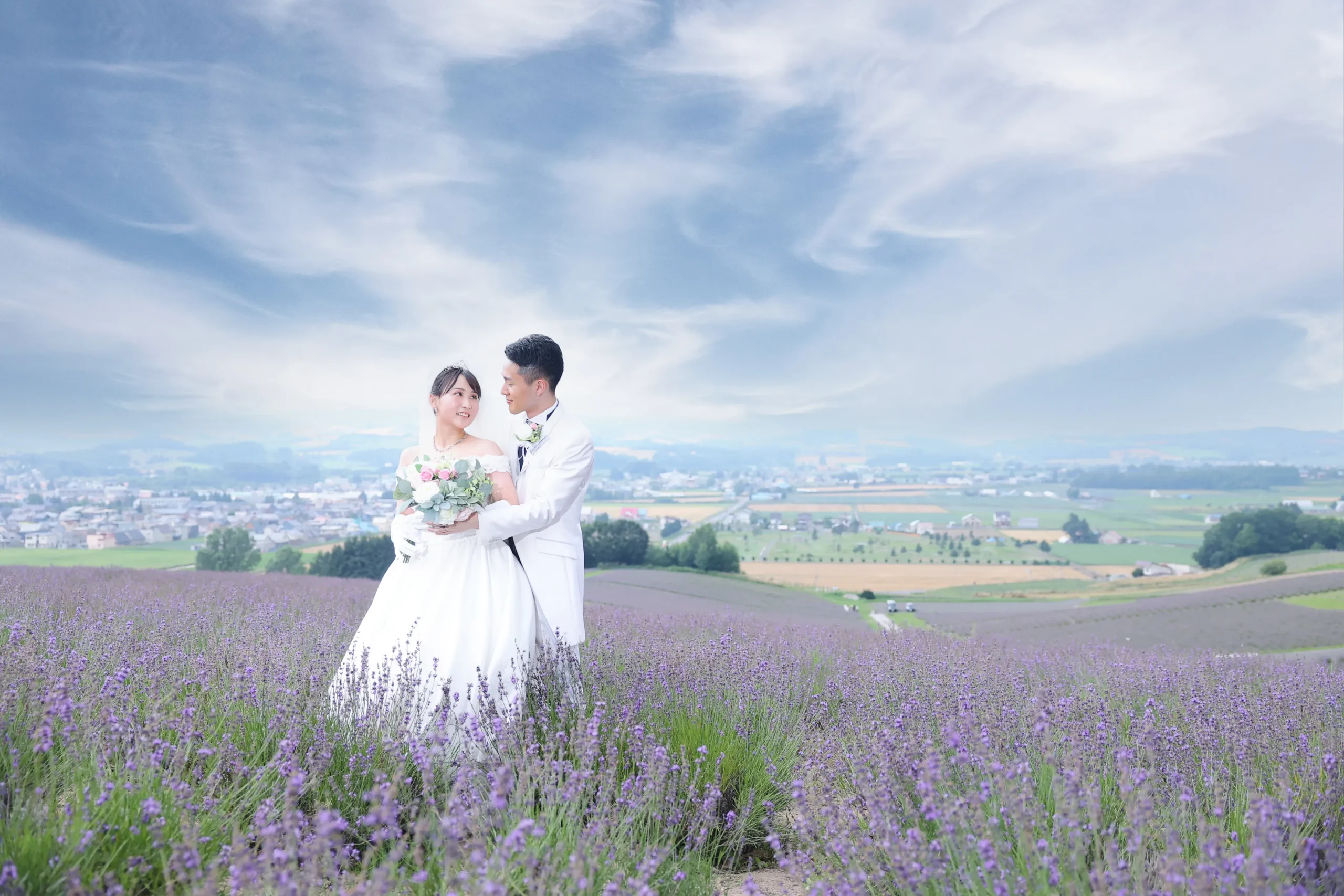 北海道のイメージにぴったり!ラベンダーの花畑の真ん中で、真っ白な衣裳に身を包んだおニ人の美しいショットが残せる。北海道らしい景色に、絵画のような山並みも華を添えます。