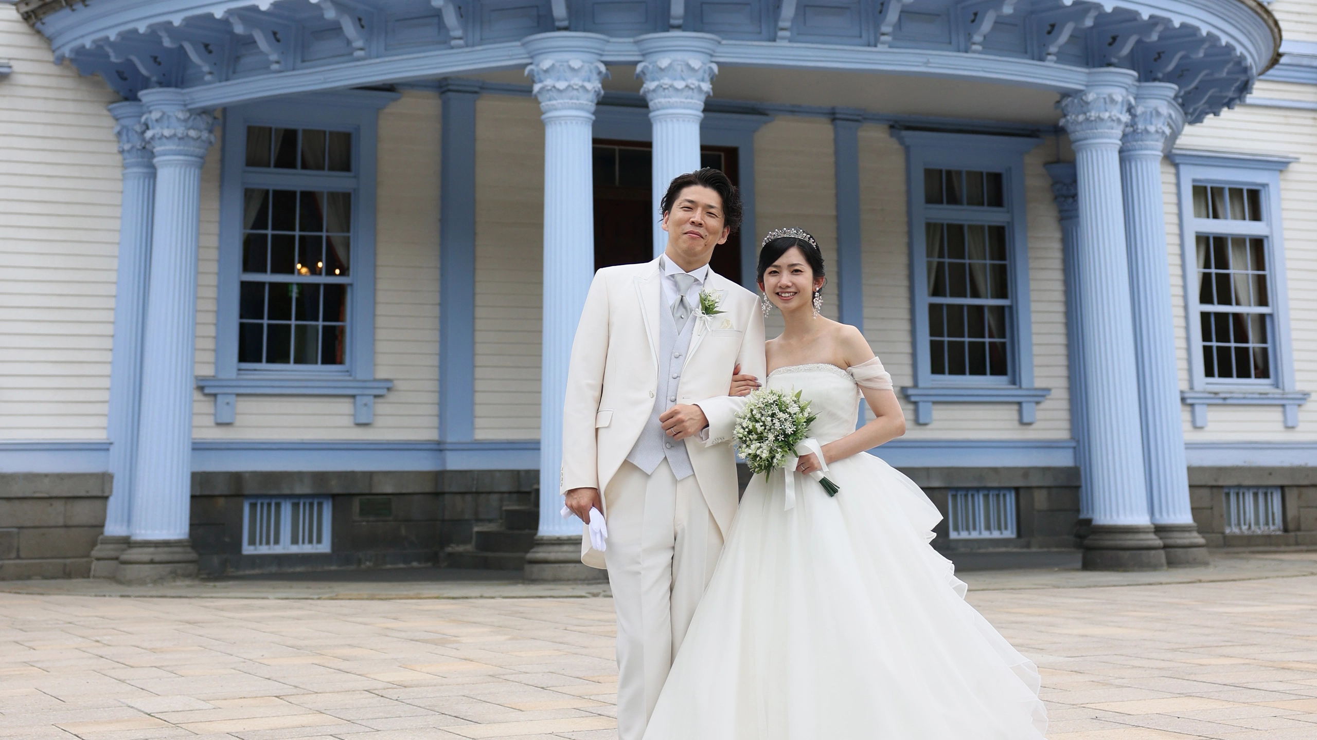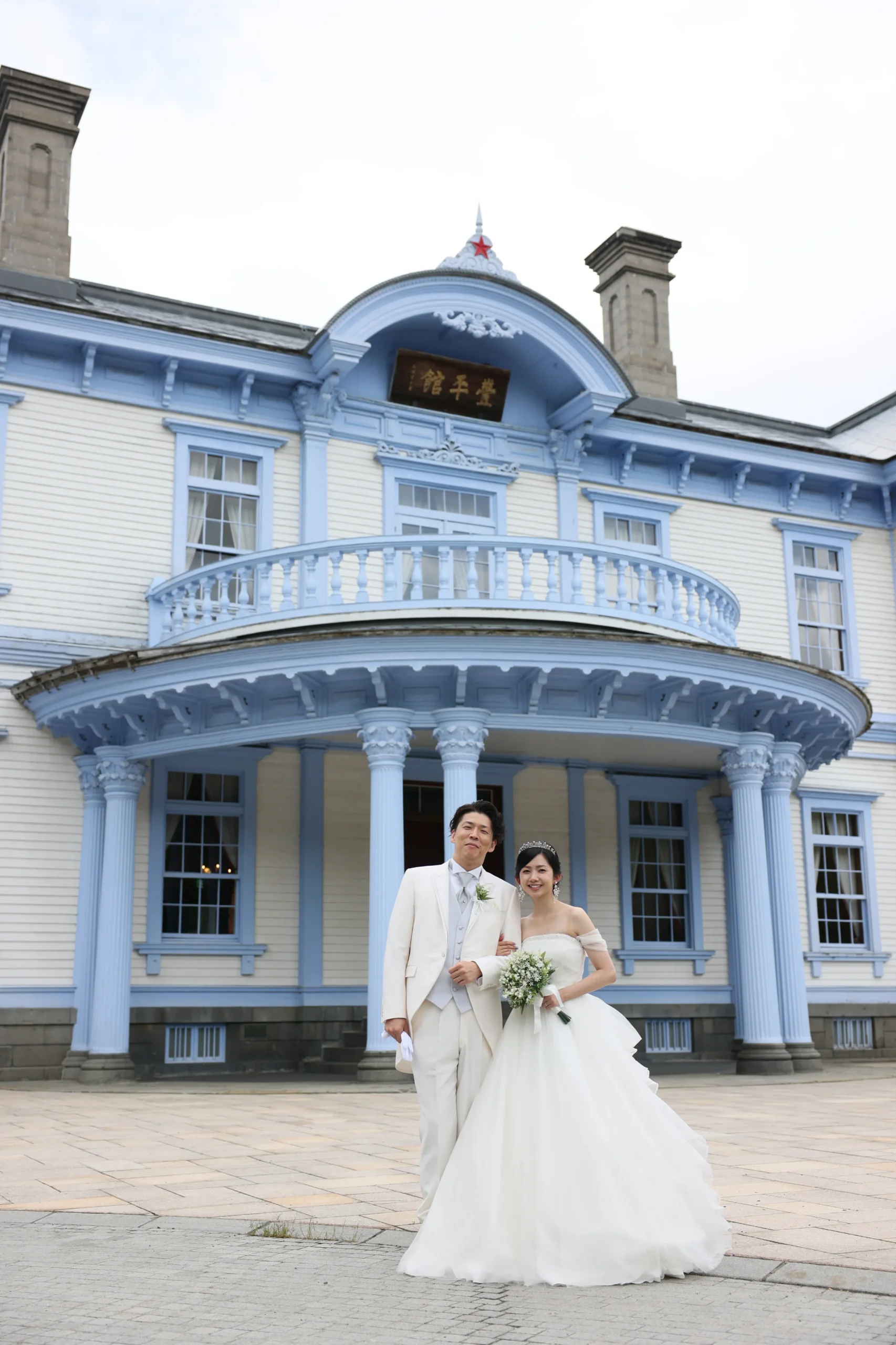 明治初期に建てられた、国指定重要文化財「豊平館」とおニ人の衣裳の色味がマッチした、かわいらしいお写真。豊平館のダンスパーティにやってきたゲストのような物語を感じさせます。