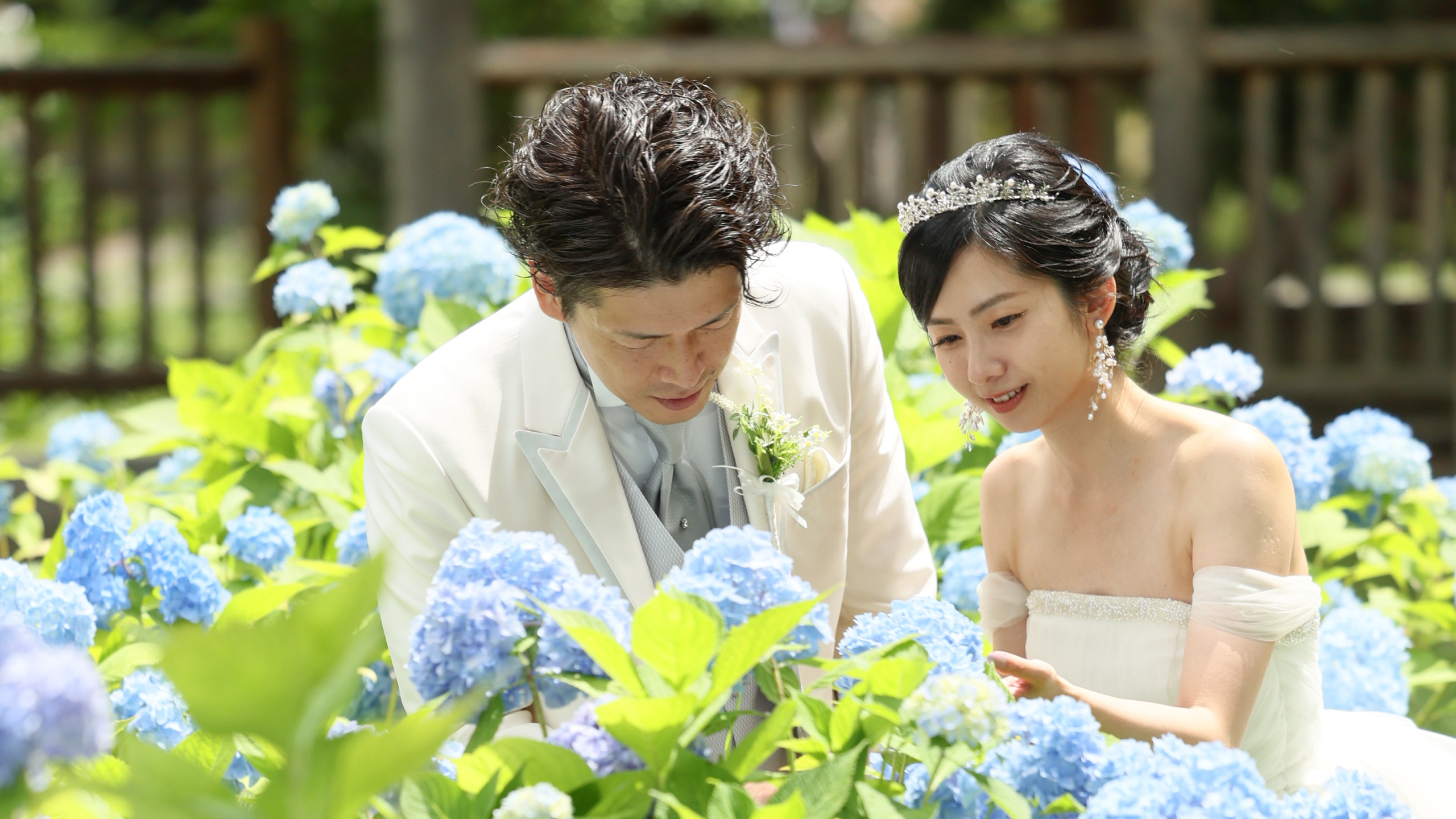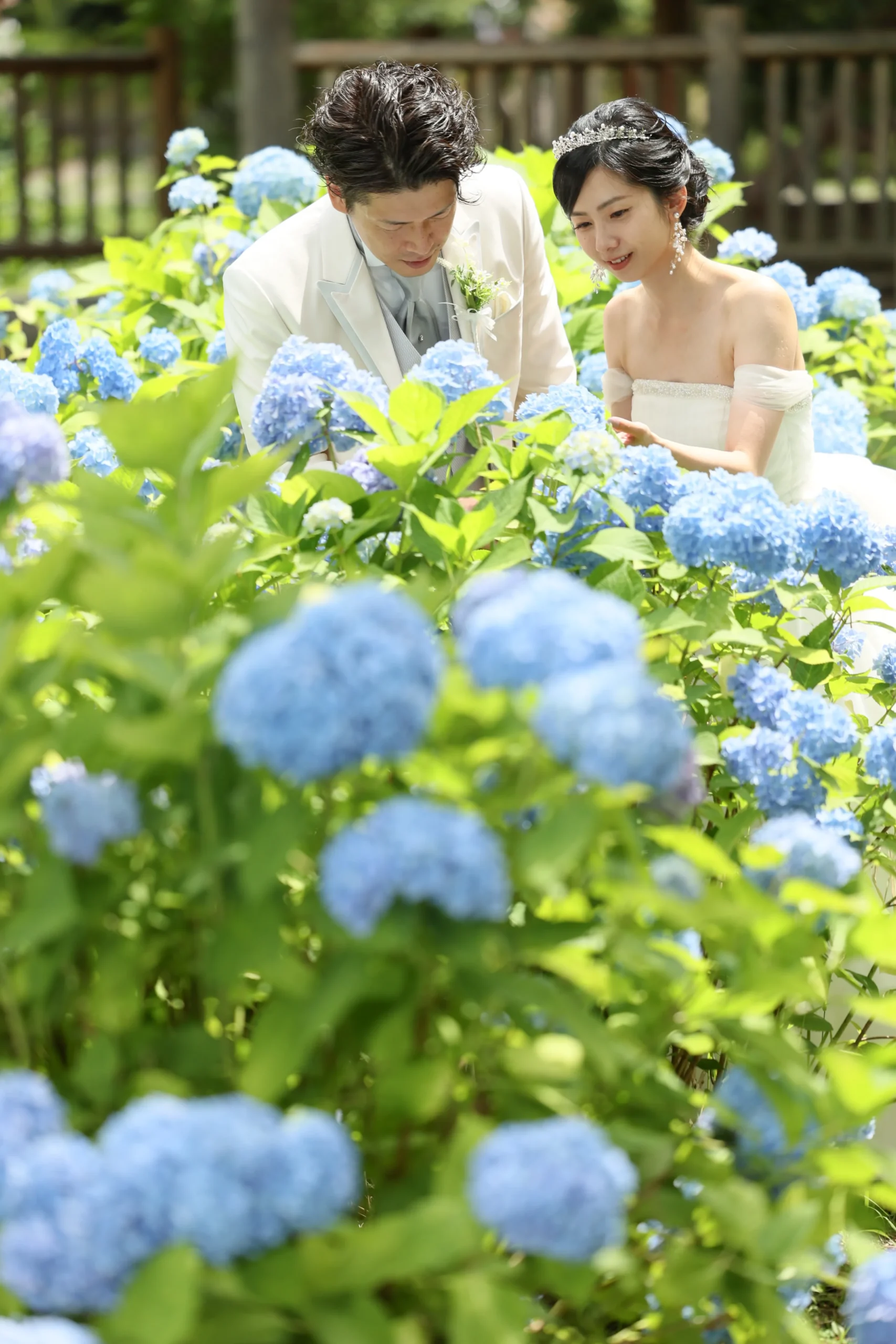 夏に咲くアジサイとのお写真も素敵です。中島公園内には様々な季節にあわせて咲く沢山の花々が植えられています。ご希望の季節に咲いているお花も一緒にチェックしておくことで、おニ人だけの素敵な写真を更に楽しく撮影できます♪