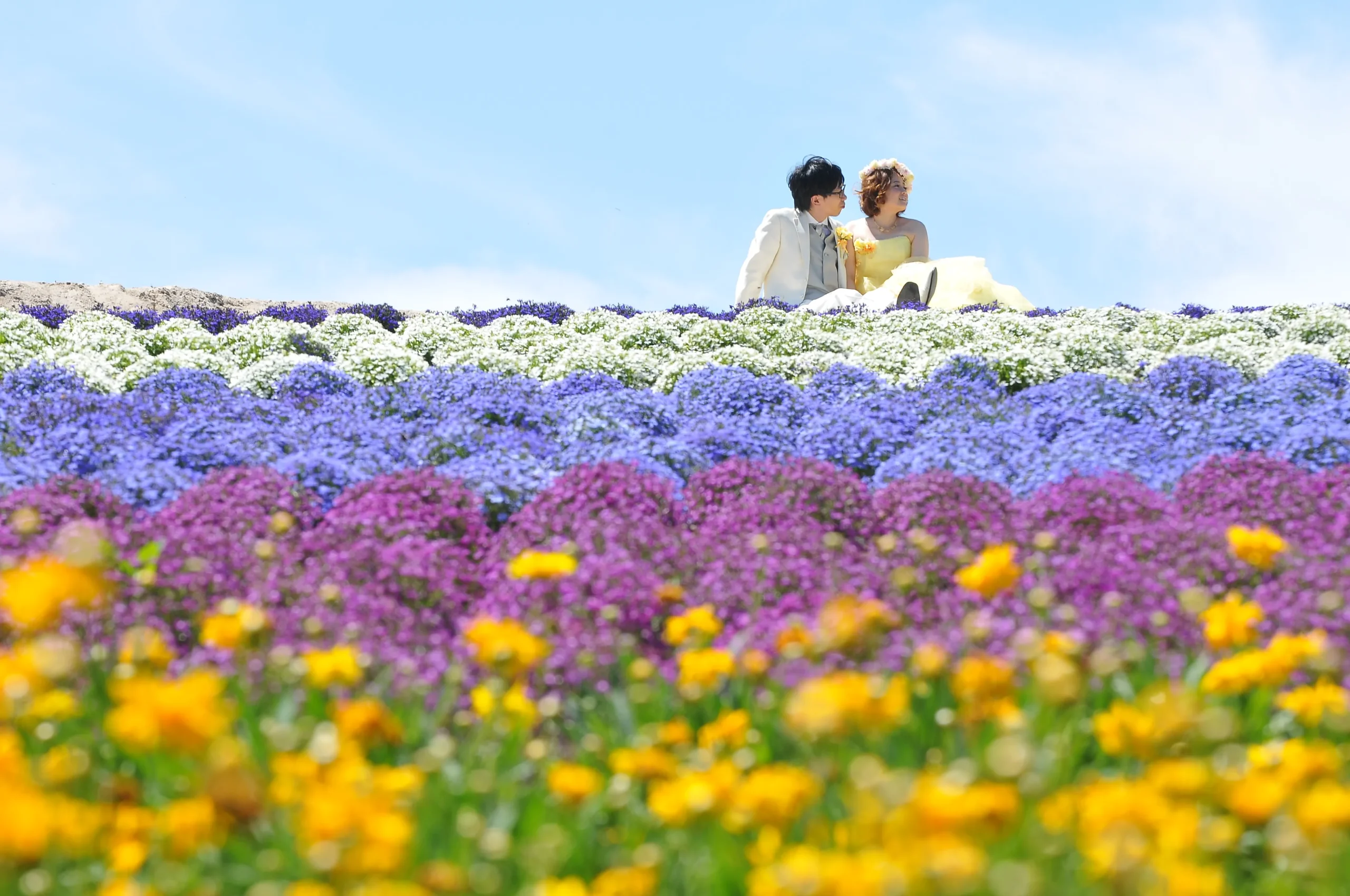 花が美しい上富良野だからこその一枚。色ごとに規則正しく植えられた広大な花畑はどこで撮っても絵になるお写真間違いなし!広大な花畑の中で、おニ人のベストショットを探してください