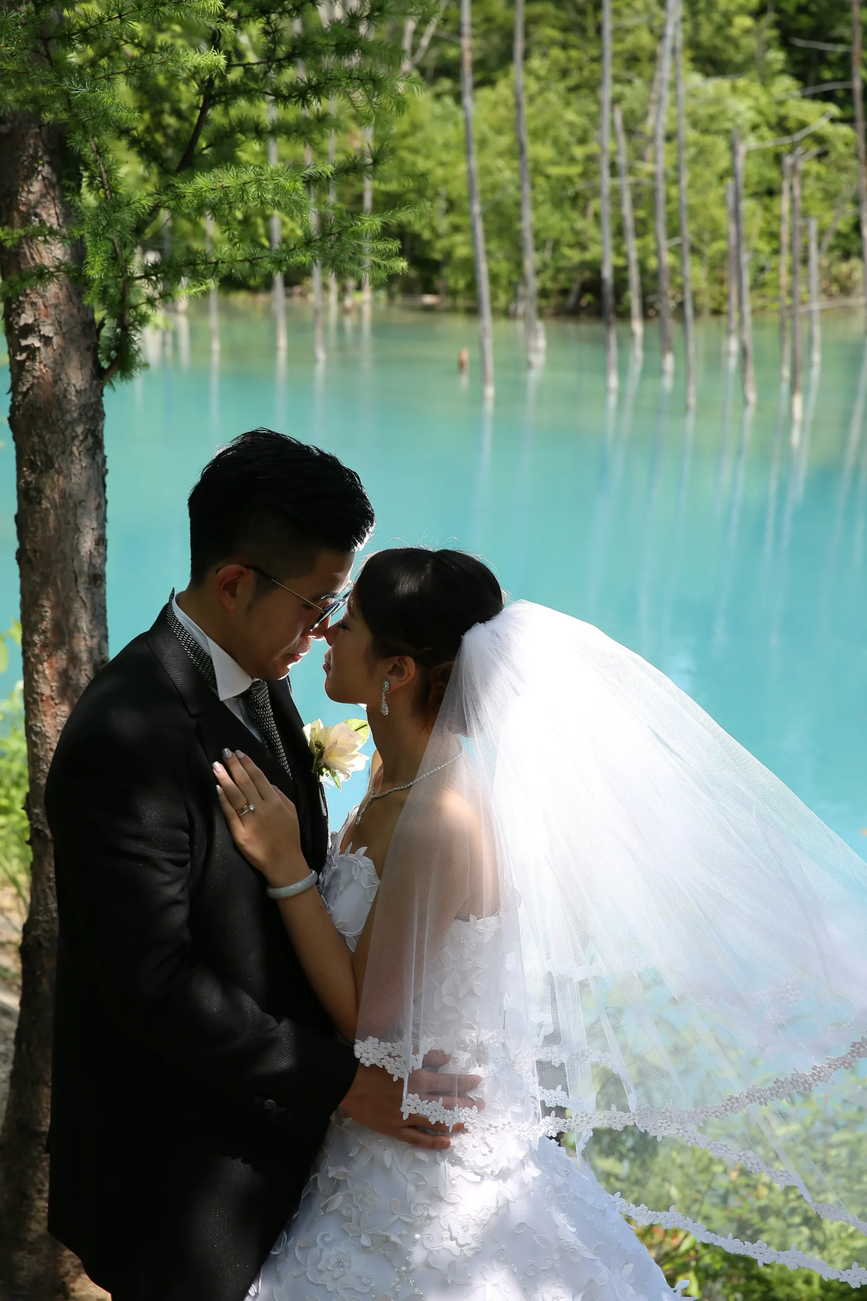 美瑛町の人気観光スポット、青い池でもロケーションフォトが残せます。人気の観光スポット×特別なお衣裳で撮影すれば、旅行の想い出としても印象的に。お天気や訪れた時期によって池の青さも変化するのでおニ人だけのお写真になること間違いなし!