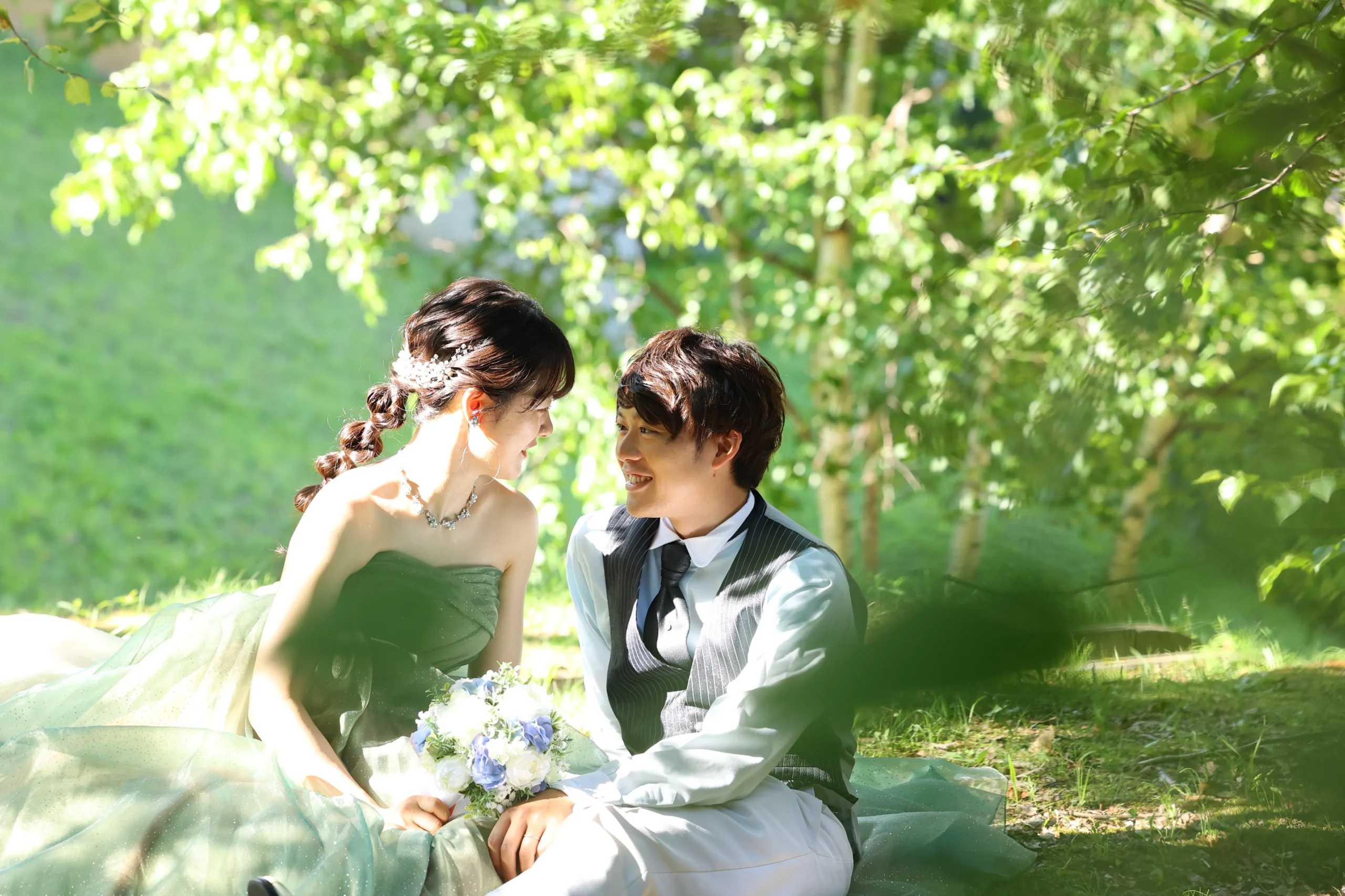 イルムの丘の広大なガーデンでは、緑を活かした素敵なお写真がオススメ。暖かい季節には明るい日の光が、おニ人を柔らかく照らします。ガーデンの雰囲気に合う柔らかい色合いの衣裳や小物がかわいらしい色どりを添えます。
