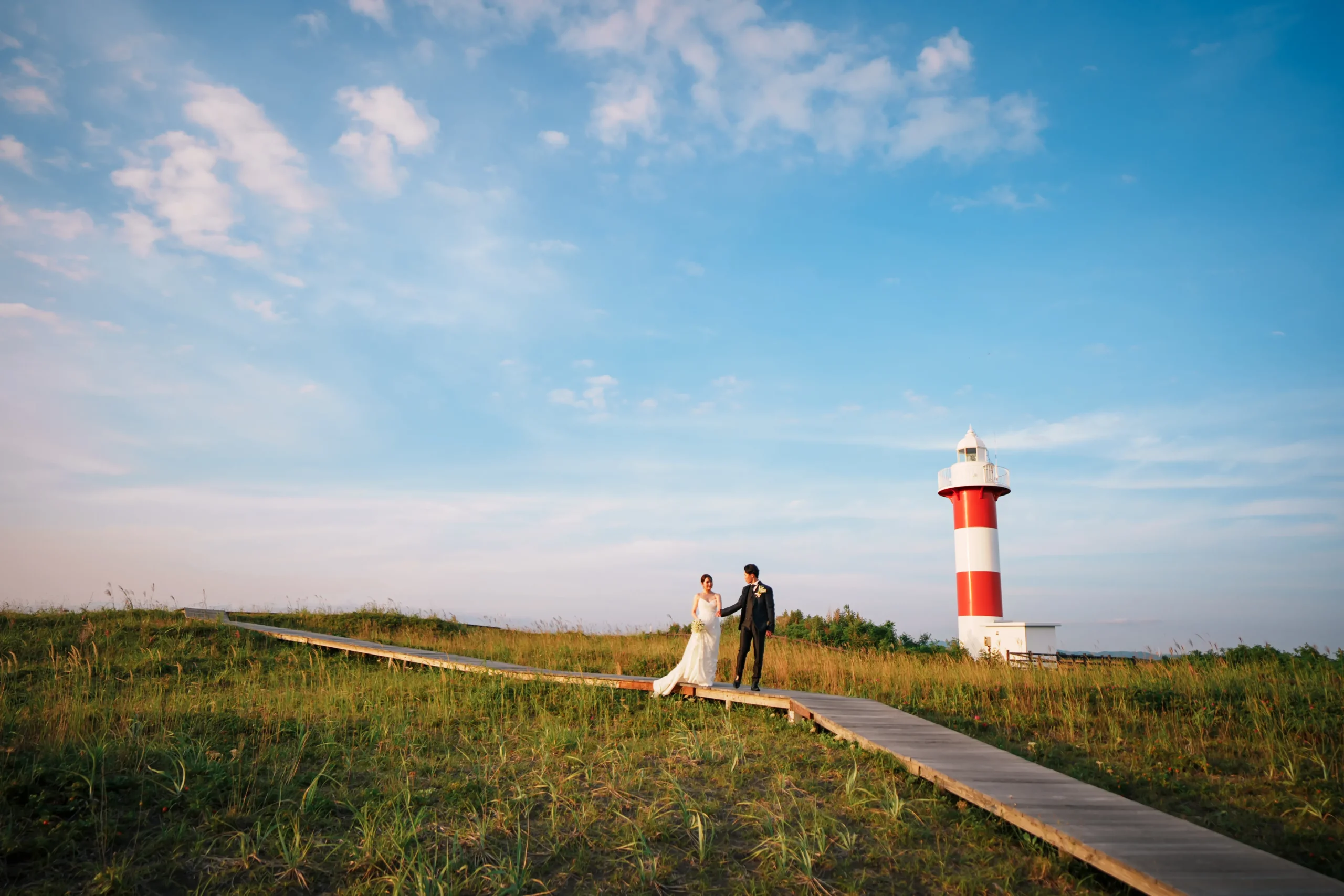 石狩湾沿いにあるはまなすの丘公園では、北海道では珍しい灯台や砂浜でのビーチロケーションが叶います。砂浜や湿地の上に作られた桟橋など、この場所ならではの景色が見られます。海に沈む夕日や、明るい日差しの中での撮影など、時間によって変わる風景も楽しんで。
