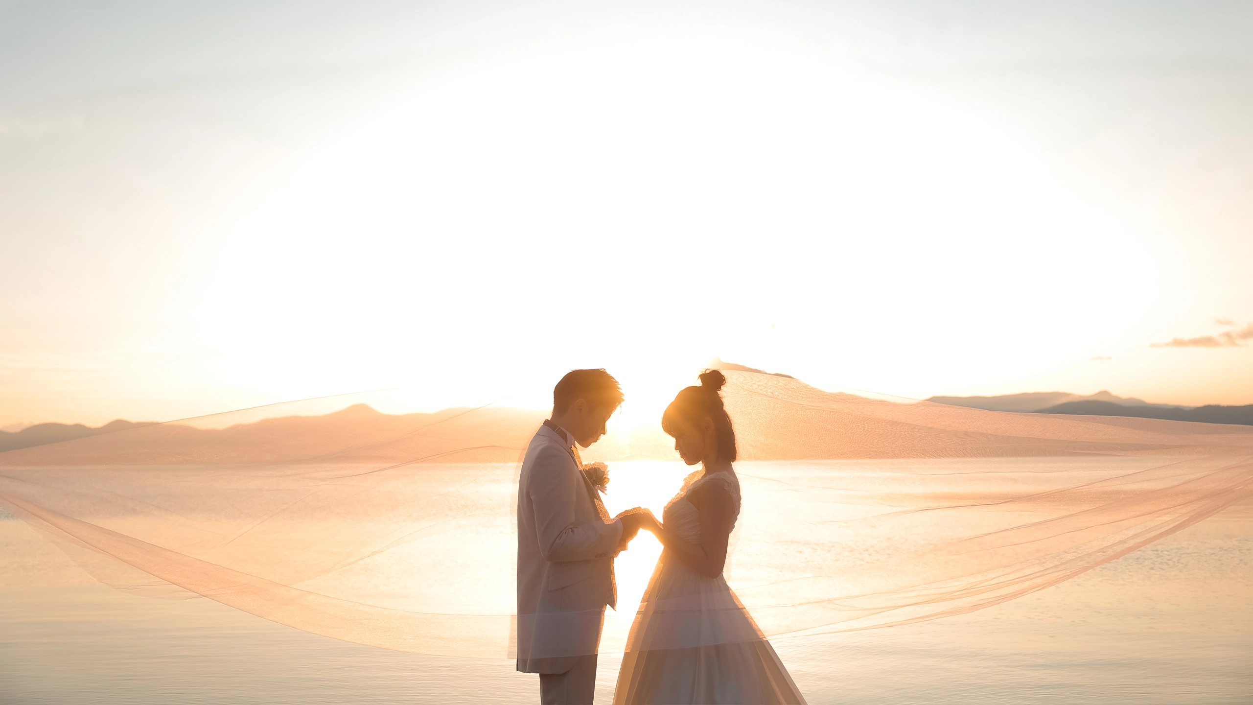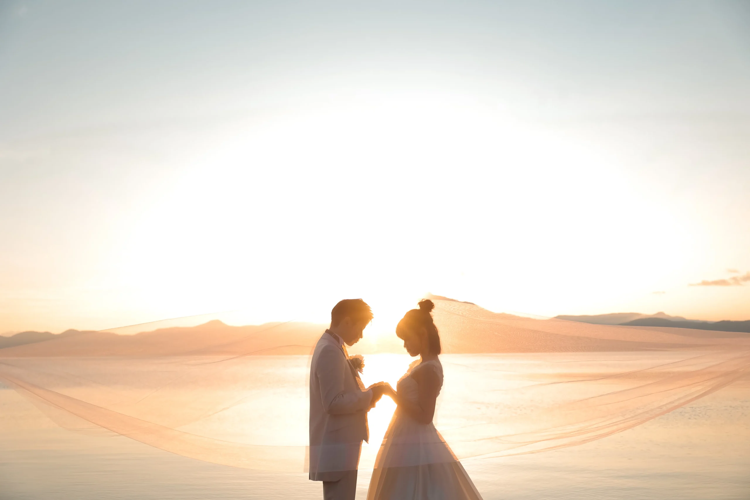 夕暮れの湖畔、空は茜色に染まり、静かに沈む太陽が水面を金色に照らす。ふたりのシルエットが寄り添い、言葉よりも深い絆がそこにある。自然が描くこの一瞬が、永遠の愛をそっと包み込む。