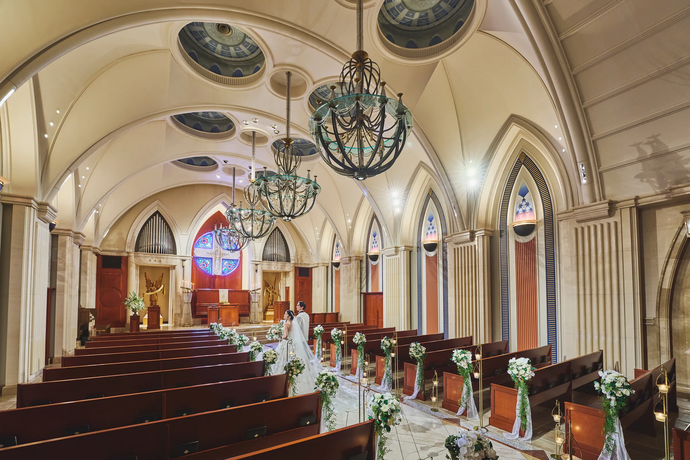 大理石のバージンロードとステンドグラスから差し込む光が、おふたりの未来を優しく照らします。